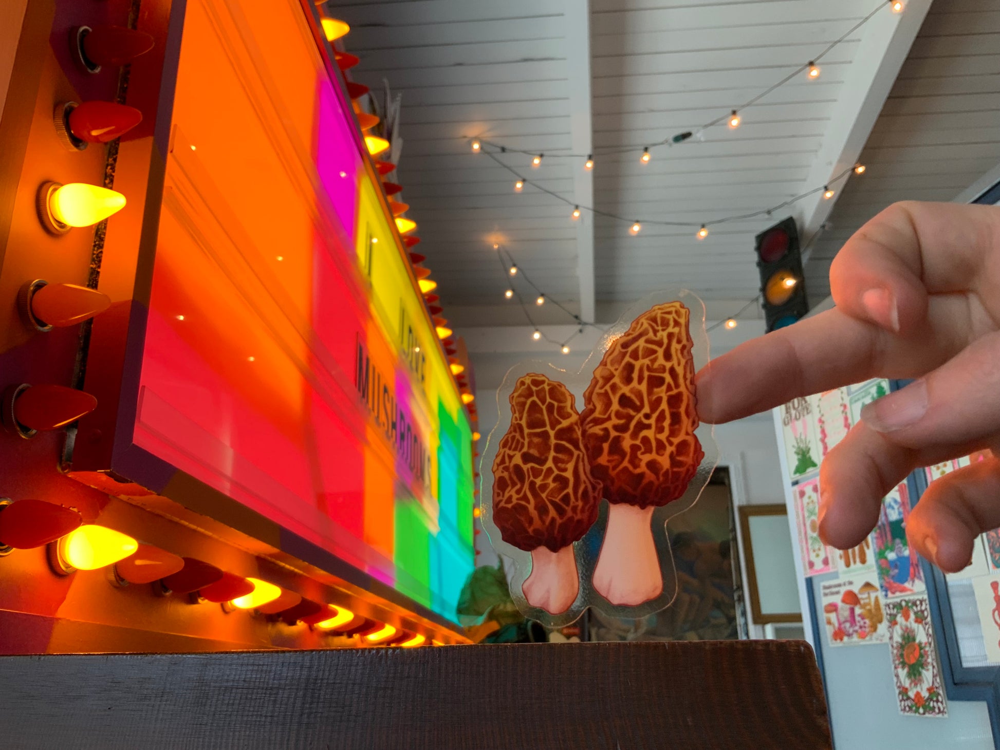 A weatherproof, clear backed vinyl sticker of a pair of morels! From an original drawing, the white boarder is actually clear when you use the sticker.