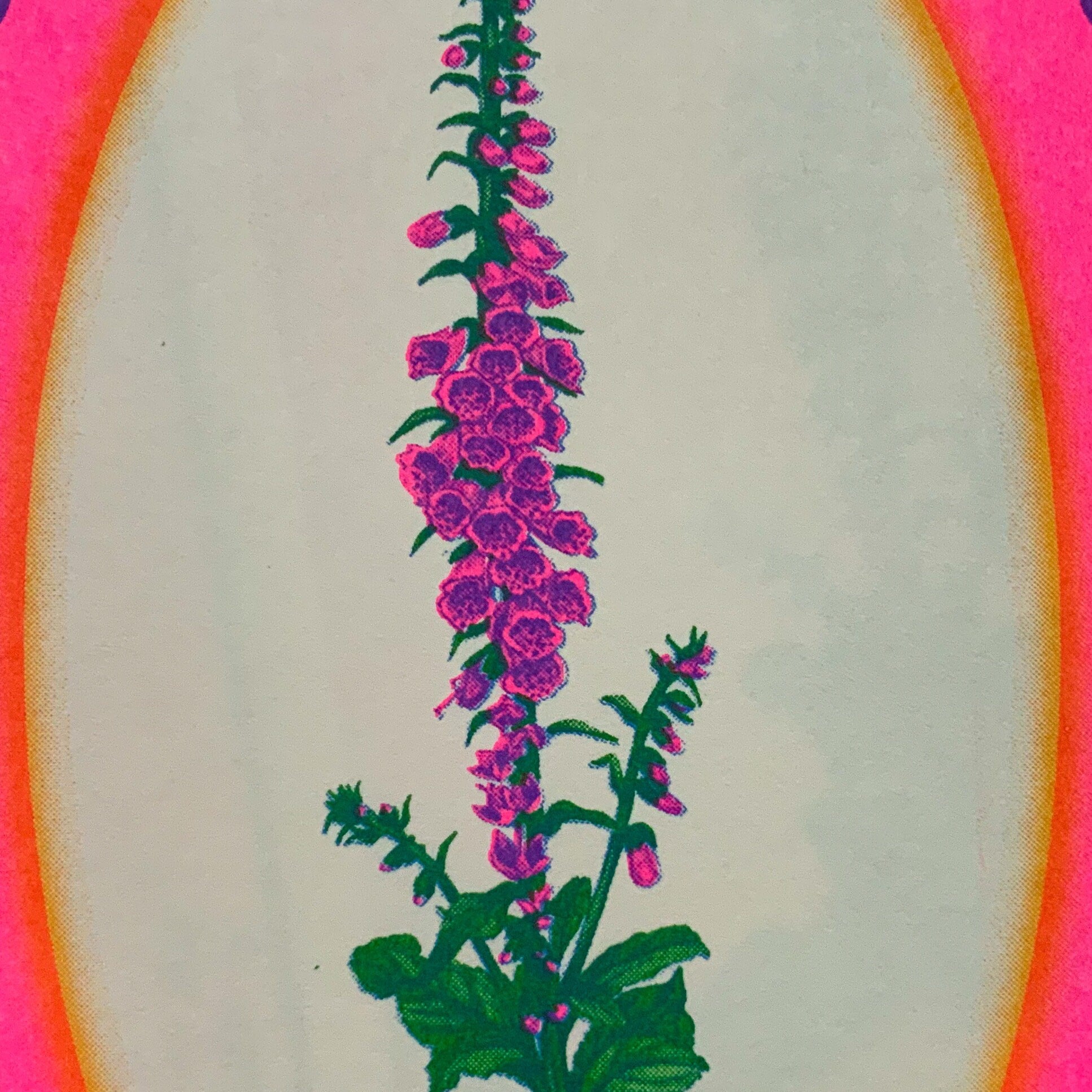 A small, 5.5" x 8.5" four color riso print of the deadly foxglove flower. This is from an original drawing of a flower in my neighborhood. Printed in florescent pink, sunflower, green, and cornflower on ivory paper for an extra vintage look. Each color is printed separately making each piece unique! Misregistration is expected :)