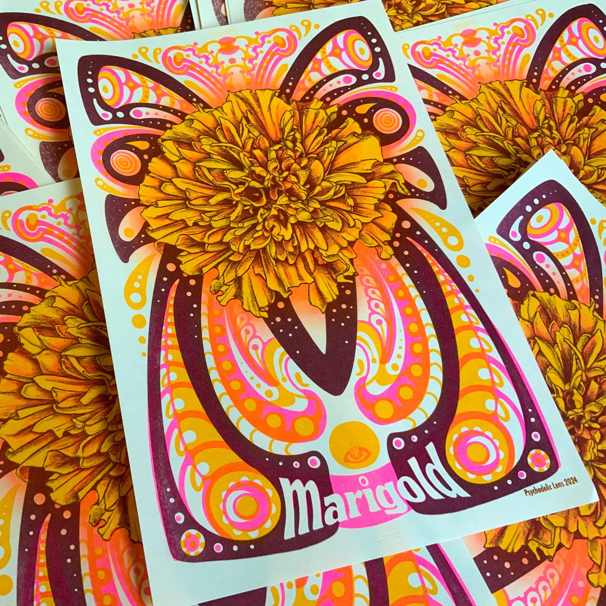 A large 11” x 17” three color riso print on warm cream paper. This is an original drawing from a marigold in my neighborhood. Printed in florescent pink, sunflower, and burgundy. Ships flat in 100% biodegradable packaging.