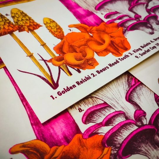 A vibrant, 3 color, 11"x17" riso print with 12 different mushrooms, each numbered and identified. Printed in florescent pink, burgundy, and sunflower yellow on ivory paper. Each mushroom is from an original graphite drawing. Riso prints are similar to screenprinting, some slight registration misalignments are normal.