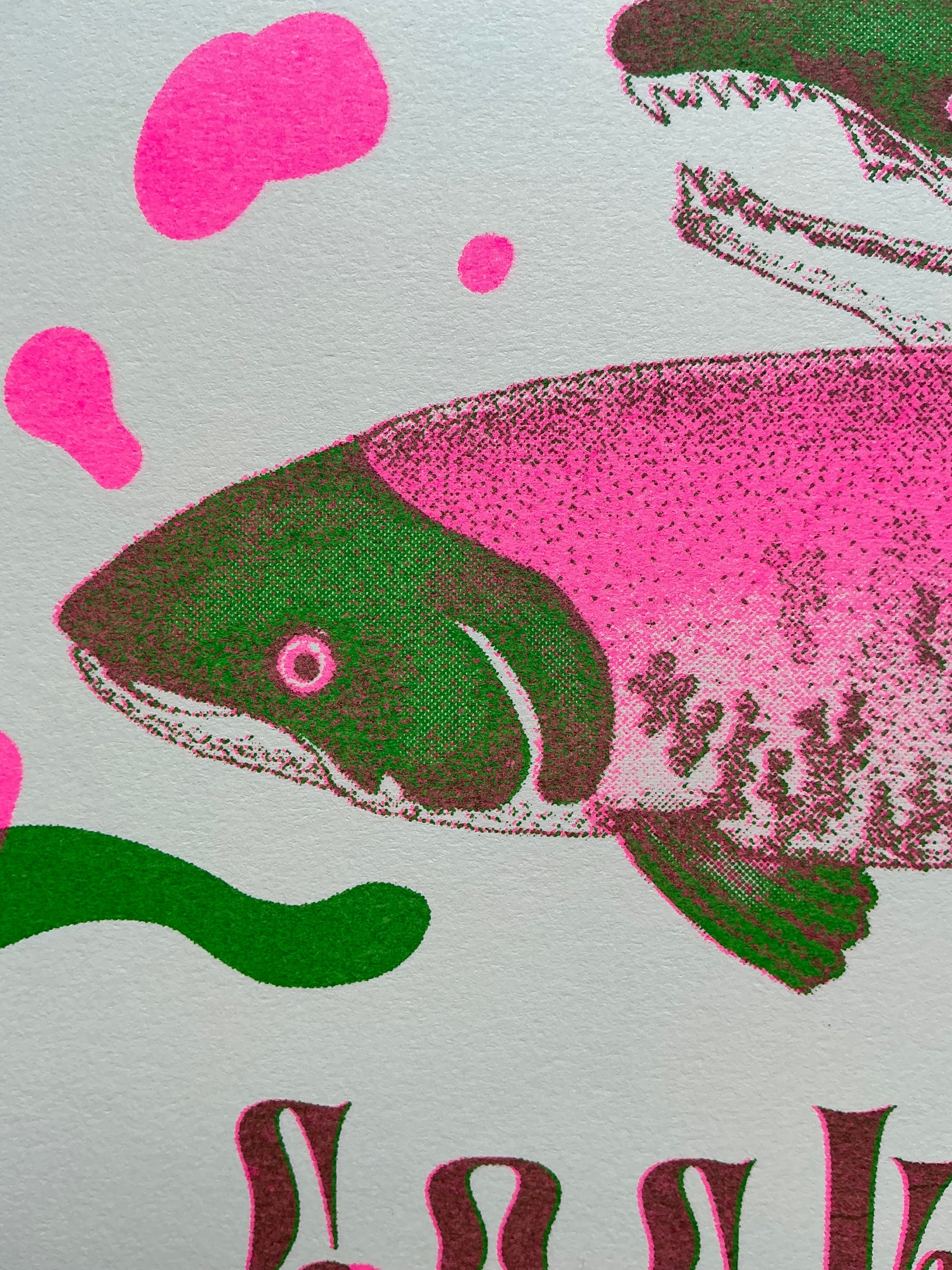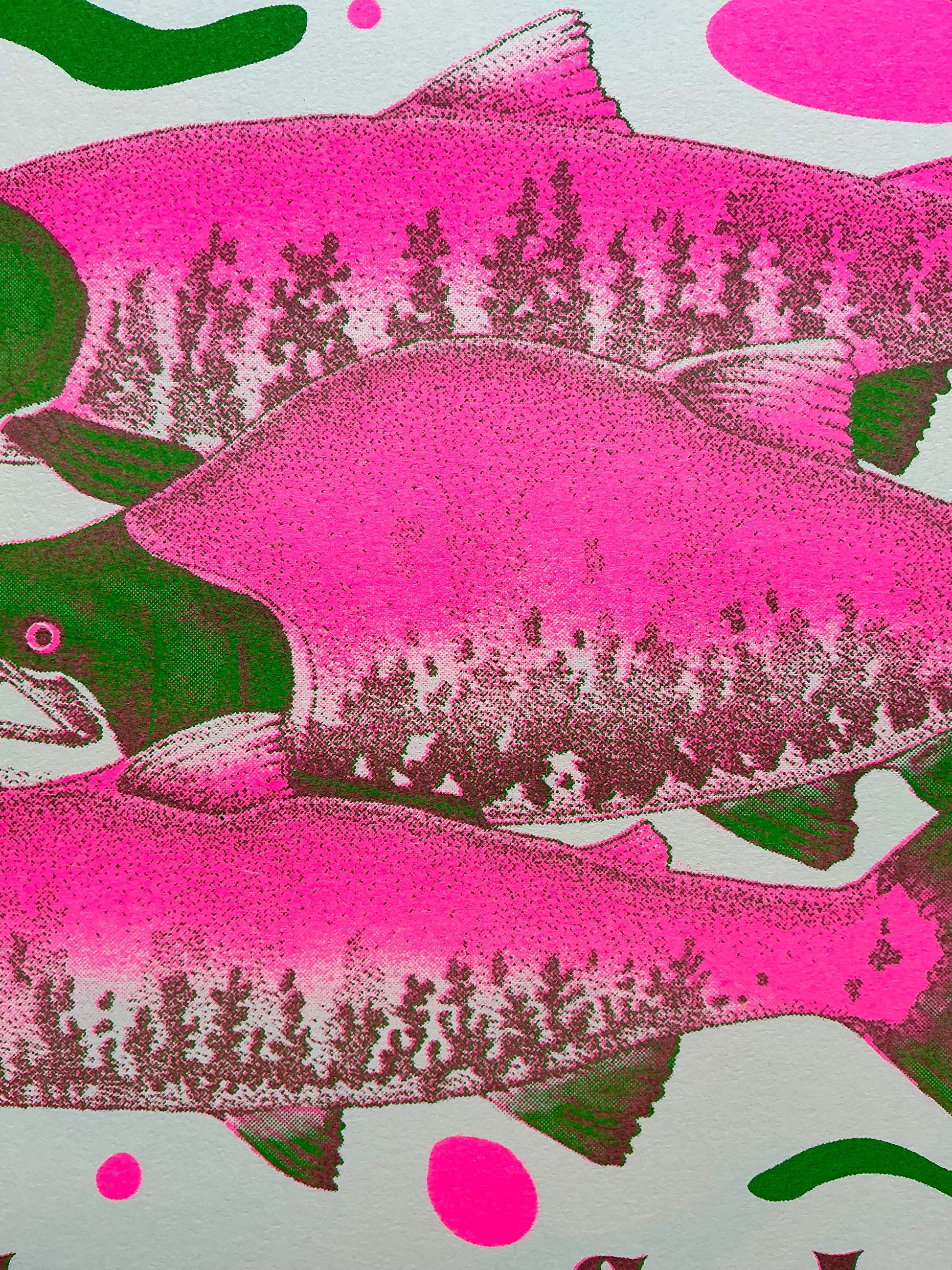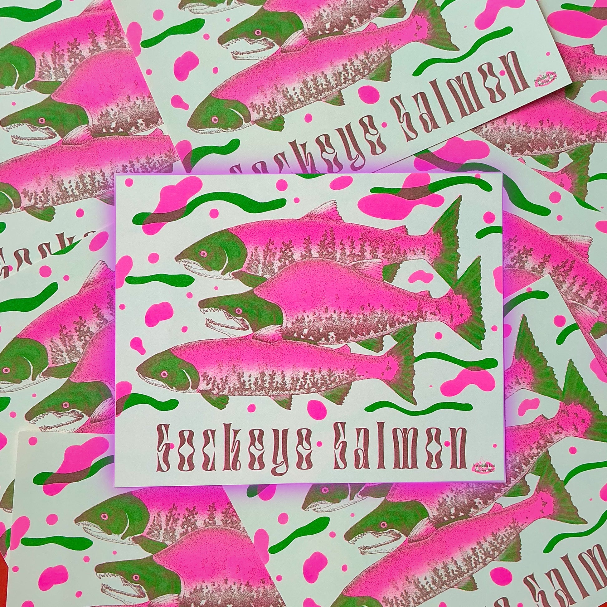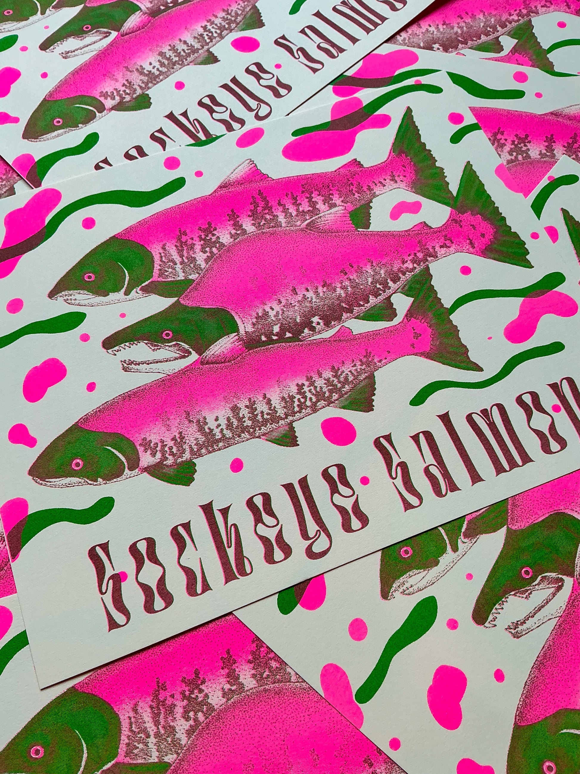 An 8" x10" two color Riso print, printed with florescent pink and Kelly green on ivory paper. From an original ink drawing of Sockeye Salmon. Ships flat in 100% biodegradable packaging.