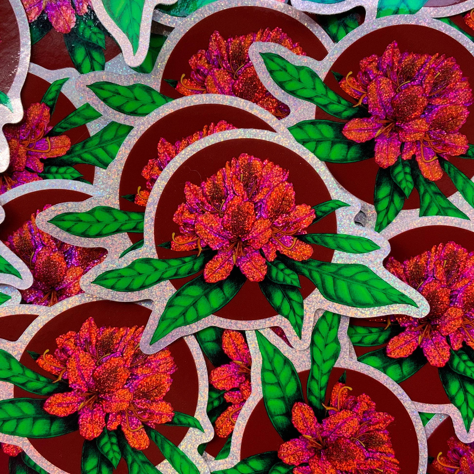 A sparkling rhododendron! Weatherproof vinyl sticker from an original drawing. The edges and the flower petals have a glittery shimmer. The state flower of Washington and official flower of Nepal!