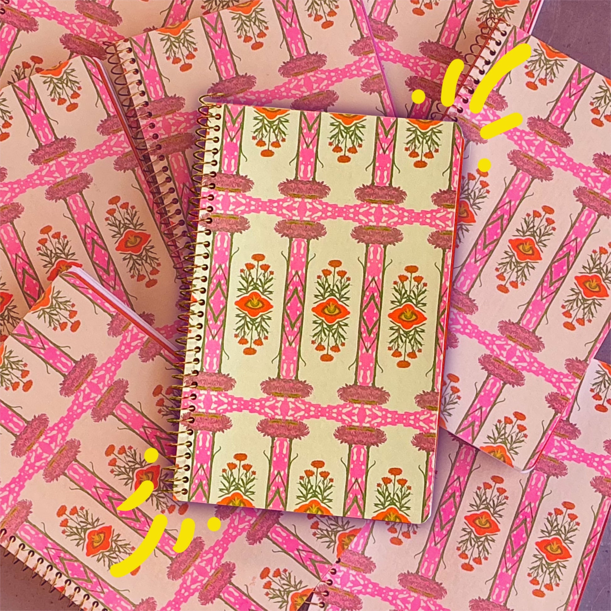 A roughly 8"x5.5" spiral bound journal. This size is good to take on the go. Riso printed cover/back cover from original botanical art with roughly 100 sheets of 100% Post-consumer waste recycled interior white paper. Orange and purple interior end pages with rounded out edges. (Fancy!) The journal is bound together with a gold colored metal spiral. Journals are made in-house :)