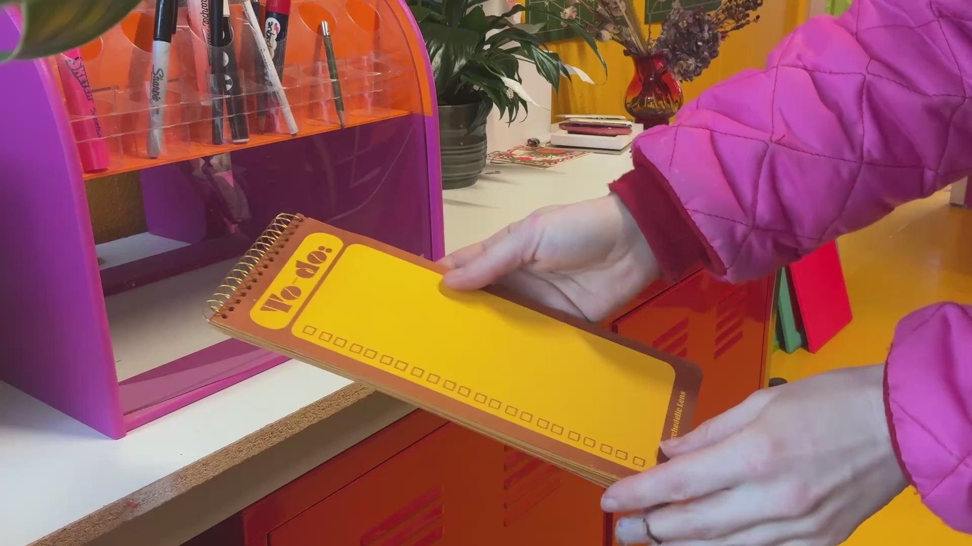 Get it done! A spiral bound, riso printed to-do list with 50 sheets. These are long guys for your extra long list of tasks. These are printed with burgundy ink on three types of paper to choose from, a golden yellow, burnt orange, and purple.