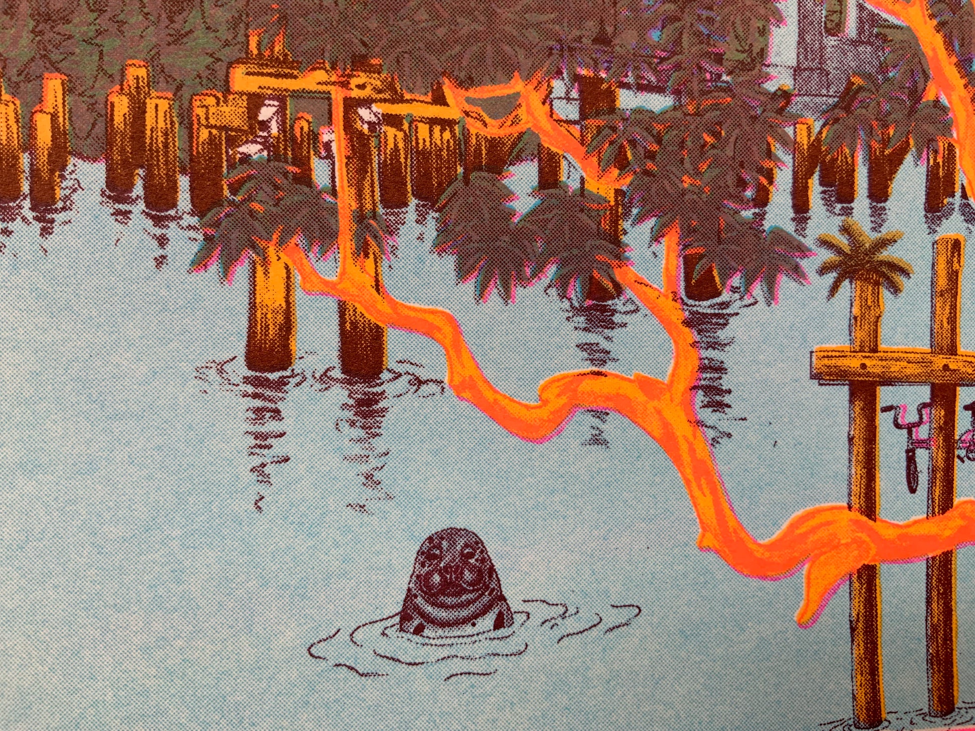 Misregistration is normal in riso prints, makes each print unique! Keep out of direct light to keep the neon colors bright.